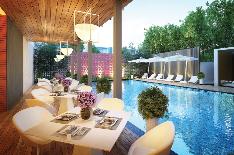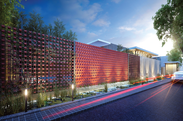Exposed brick facade designed uniquely to screen off the swimming pool from the outside providing a sense of privacy andexclusivity