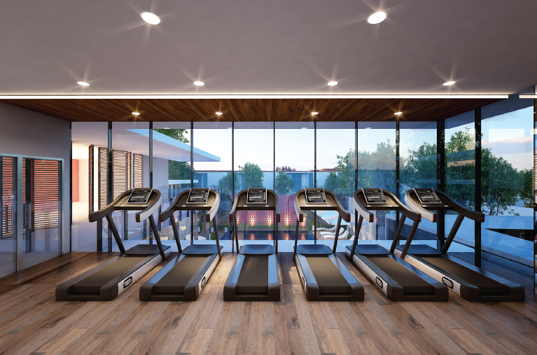 In-house gym facilities for the fitness enthusiasts that looks out into the pool below.