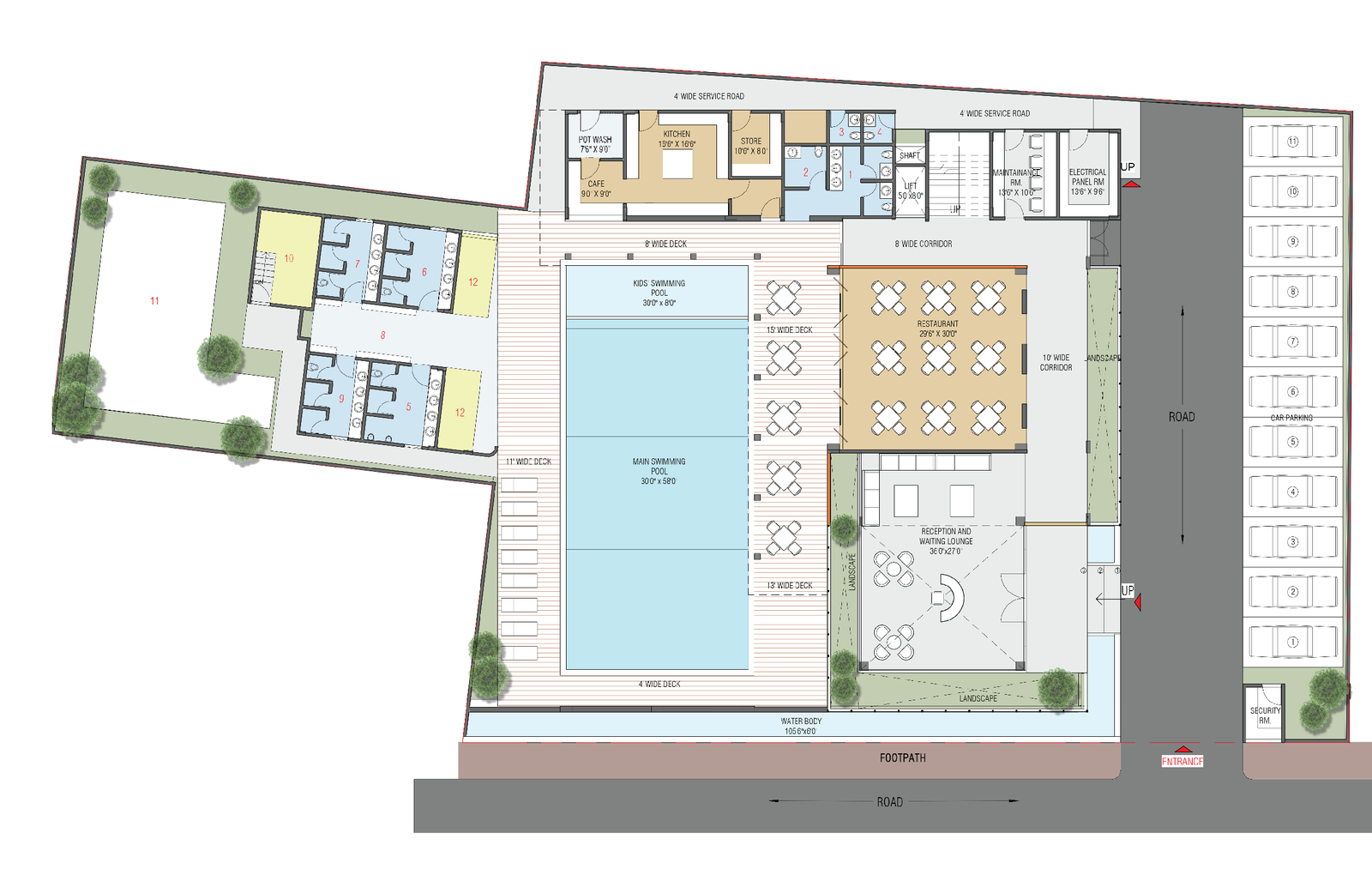 SPRINGFIELDS 17000sqft. exorbitant CLUB HOUSE is designed true to its purpose.Its exterior reflects a material palette similar to all the villas i.e. earthy, rugged and natural with a perfect blend of modernaesthetics, large overhangs, glass facades and landscaped screens to create that interest as one enters.